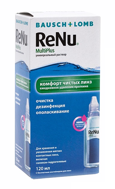 ReNu MultiPlus компании Bausch+Lomb предназначен для химической (не термической) дезинфекции, ежедневной очистки, ежедневного удаления белковых отложений, смачивания линз, споласкивания и хранения любых мягких контактных линз, включая силикон-гидрогелевые, рекомендованные врачом.